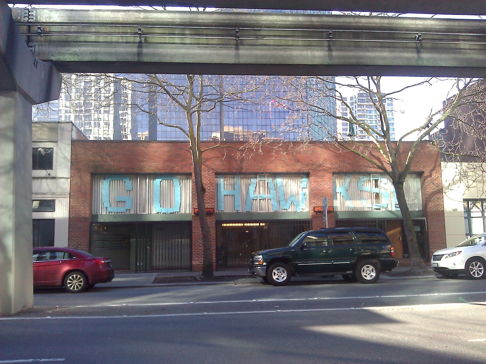 GOOD: Below the Monorail on 5th Avenue, this Seahawks fan will be running low on blue printer paper in the next week or two.