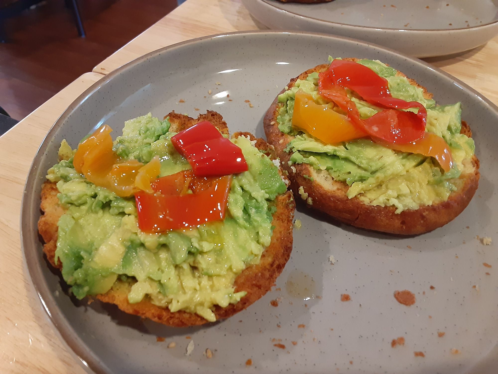 9:30 a.m. Homemade toasted cemita buns with mashed avocado and Mama Lil’s peppers. These yeasted buns are light and fluffy inside, a perfect bread for the creamy avocado and spicy peppers.