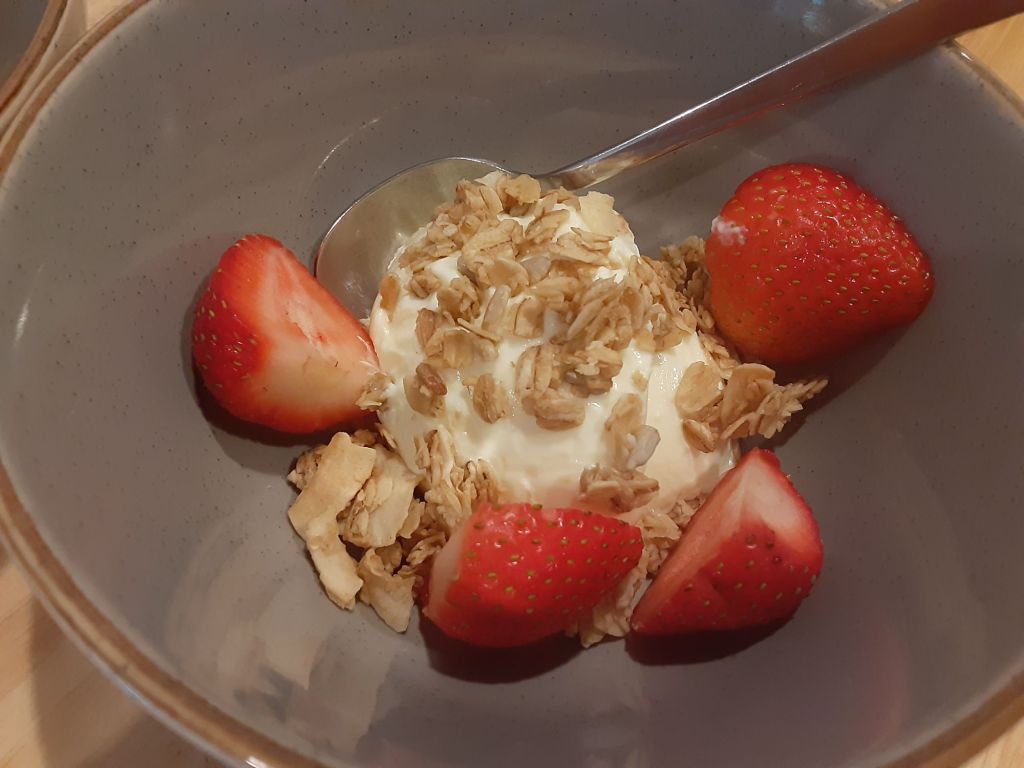 10:30 a.m. Lemon Greek yogurt with crunchy granola and strawberries. I am not usually a breakfast person or a yogurt person, but this little meal was just delightful.