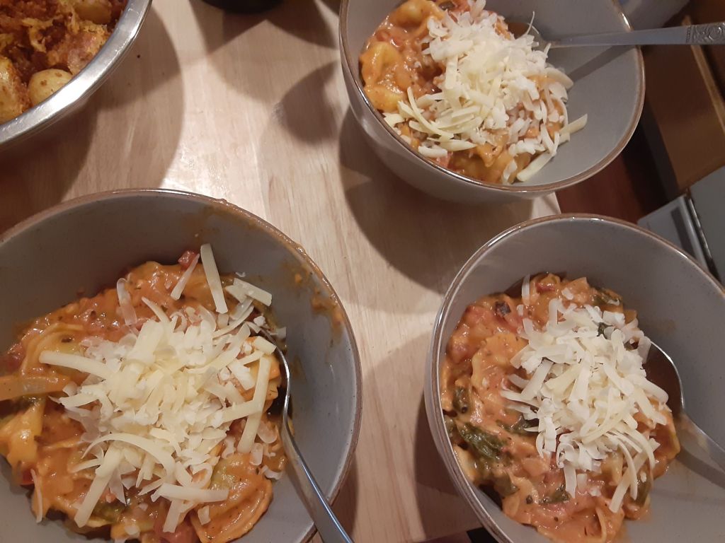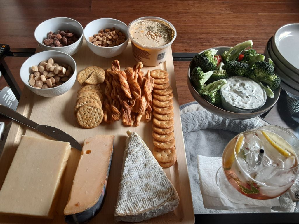 1:30 p.m. Grazing board with cheese, crackers, nuts, veggies, and dips. A good combination of crunchy and soft, sweet and salty, smoky and spicy. My friend’s homemade ranch dip was especially delicious. It also allowed us a little break in between preparing meals.