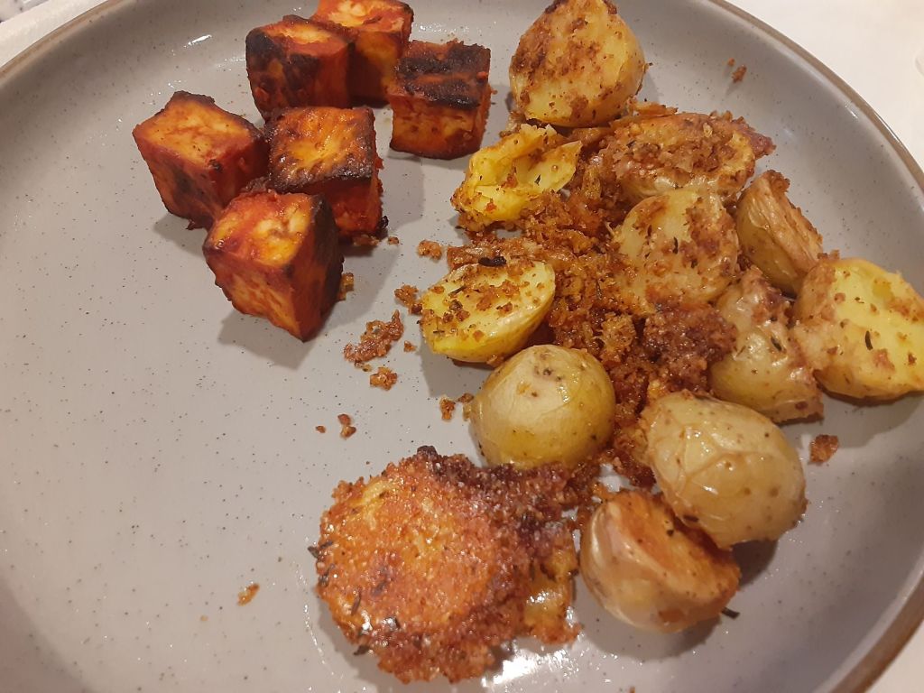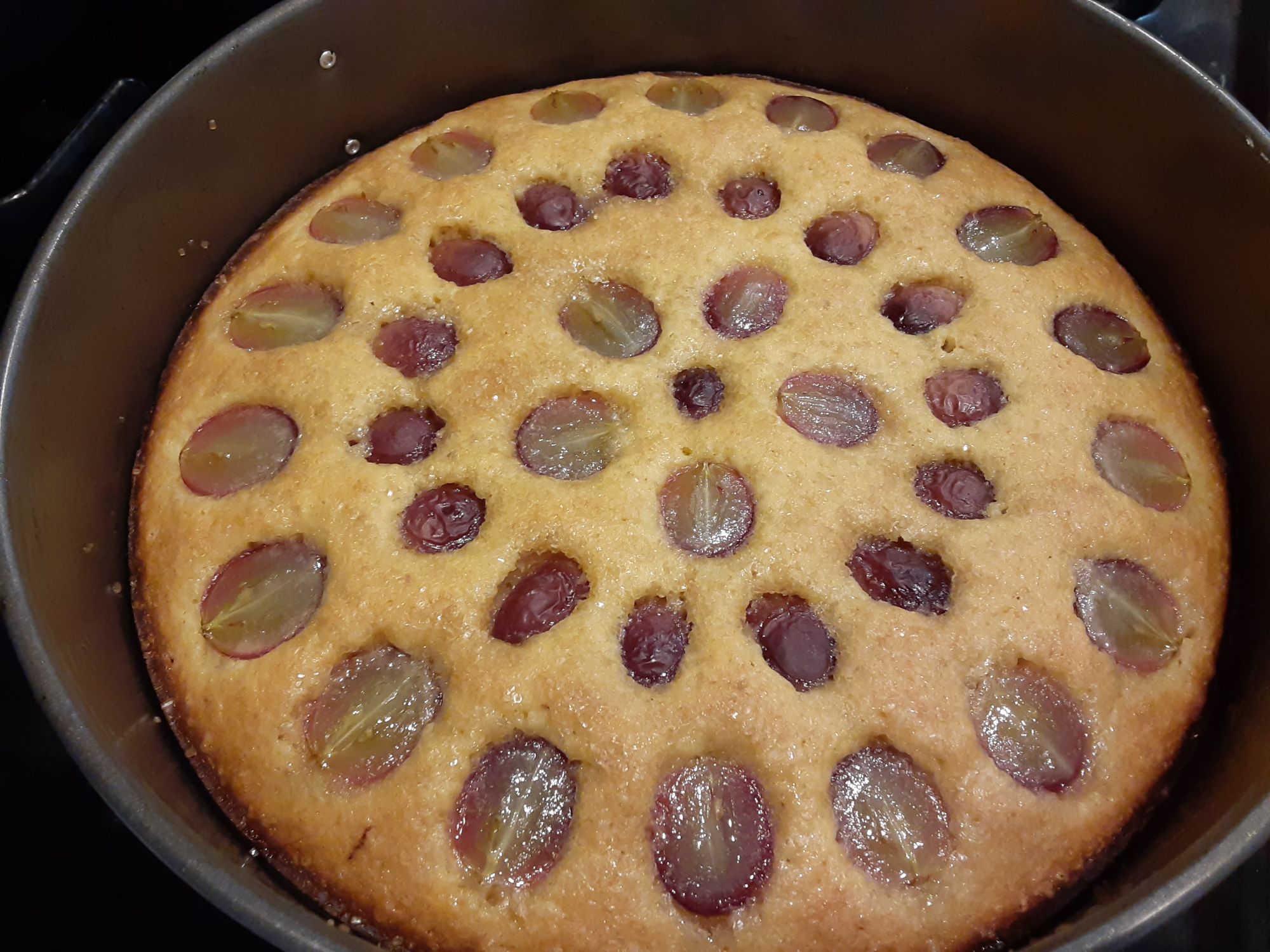 7:00 p.m. Crispy parmesan potatoes and gochujang baked tofu. It’s just not a Lord of the Rings viewing party without PO-TAY-TOES (boil ’em, mash ’em, stick ’em in a stew). And we finished up the day with a cake made with lemon, grapes, and anise – another previously tested recipe.