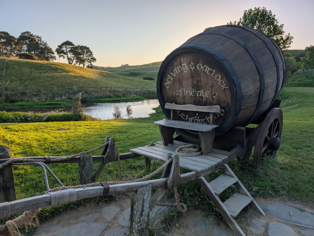 I’m not exaggerating when I saw this was the very first thing that I booked for our New Zealand vacation – even before any of the airfare, car rentals, or hotels. The evening banquet experience is the last tour of the day, and we got to see a perfect summer sunset at the Shire as we made our way over the mill pond to the Green Dragon Inn for dinner. The inn serves its own Southfarthing ales and ciders, as well as local New Zealand wines and a non-alcoholic ginger beer.