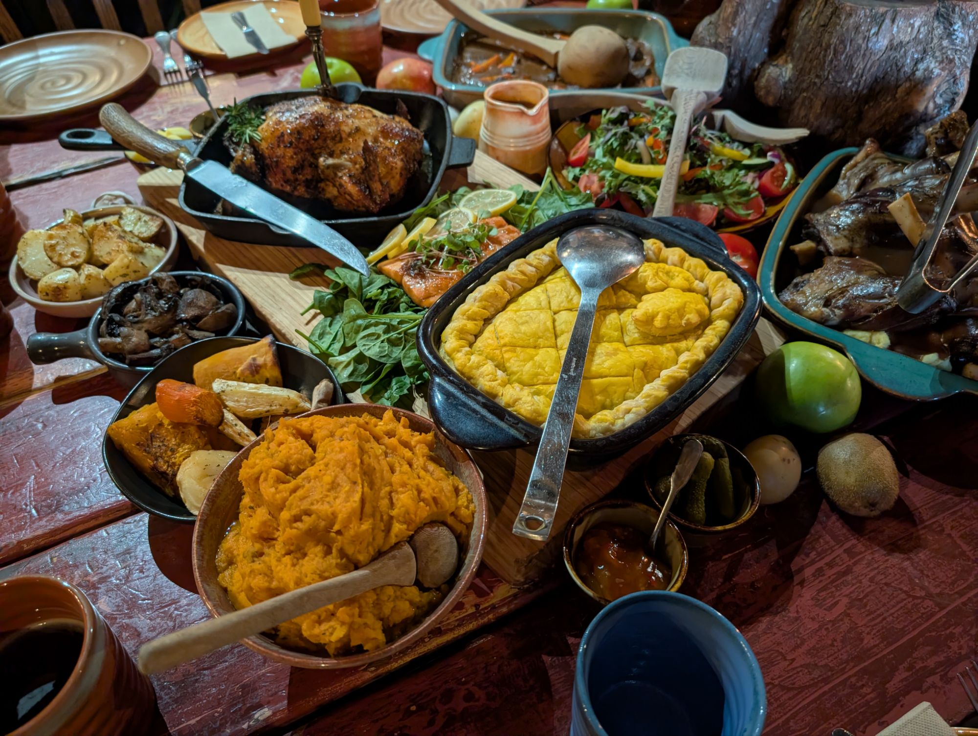 The food was excellent – exactly the types of hearty home-cooked dishes you would expect from Hobbits. There were three long tables to accommodate everyone, with identical dishes at both ends of each table. For the mains, there were roasted chickens, lamb with gravy, beef stew, and slabs of salmon. Also vegetable pot pie, salad, mushrooms, sweet potatoes, pickles, bread rolls with butter, and roasted root vegetables. For dessert, there was sticky toffee pudding with crème anglaise, fresh fruit, almond bakewell tarts, cheese, and meringue pavlovas that are a traditional Christmas treat in New Zealand and Australia.
